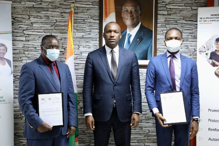 Dans le cadre de la mise en œuvre de l’axe 4 du programme social du gouvernement, le Ministre de la Promotion de la Jeunesse et de l’Emploi des jeunes, Mamadou Touré a présidé ce Mardi 15 septembre 2020 une cérémonie de signature de convention entre l’Agence Emploi jeunes, structure sous tutelle de son département, et la Plateforme des services. La signature du document a eu lieu entre Jean Louis Kouadio, administrateur de l’Agence Emploi jeunes et Charles Assoumou, secrétaire exécutif de la plateforme des services de Côte d’Ivoire. Cette signature de convention qui a eu lieu à la salle de conférence du 5 ème étage de l’immeuble CNPS du Plateau permettra de mettre en activité 4500 jeunes de 52 localités pour un cout total de plus de 2 milliards F Cfa. Dès le mois d’octobre prochain, ces jeunes seront en activité pour une durée de 6 mois. Ils mèneront des activités de balayage des voies, de curage des caniveaux ainsi que de désherbage et d’entretien des espaces publics. Ces jeunes percevront un pécule. A terme, ce sont 32 milles jeunes qui bénéficieront de ce programme. Mamadou Touré s’est réjoui de cette signature de convention qui opérationnalise de plusieurs mois de collaboration. Il promet que ces jeunes ne seront pas laissés pour compte au bout de 6 mois, « Ces jeunes bénéficieront de financement après cette période pour leurs projets. Au cours de ces 6 mois, ces jeunes bénéficieront d’un accompagnement à l’effet de leur permettre de s’installer à leurs propres comptes », a-t-il rassuré. Rappelons qu’au cours de cette collaboration, l’Agence emploi jeunes va assurer l’appui logistique, l’inscription des bénéficiaires, le financement des activités et le suivi-évaluation du projet.